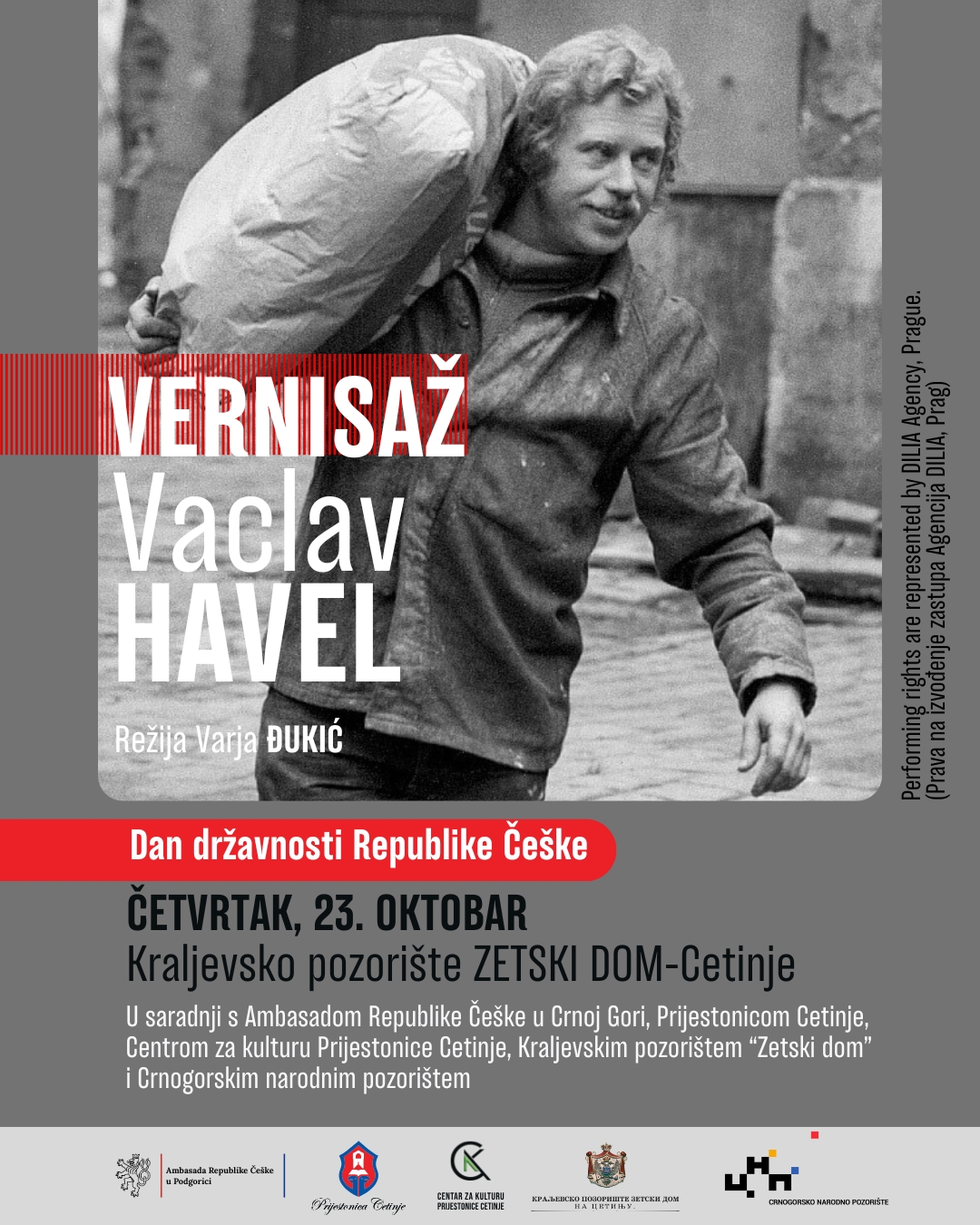 U okviru obilježavanja Dana državnosti Republike Češke, u četvrtak 23. oktobra u 17:00 časova, u Kraljevskom pozorištu Zetski dom biće izvedena predstava „Vernisaž“ autora Vaclava Havela.