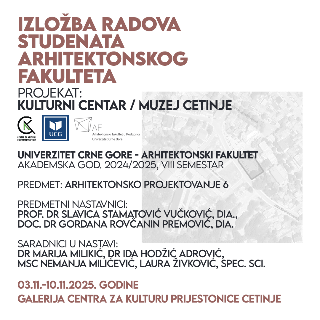 Izložba radova studenata Arhitektonskog fakulteta Univerziteta Crne Gore biće otvorena u ponedjeljak, 3. novembra u 17h u Galeriji Centra za kulturu Prijestonice Cetinje.